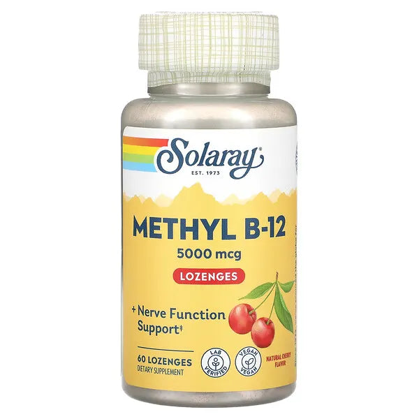 Increase energy levels and support nerve and cognitive function with Solaray's Methyl B-12 5000mcg Lozenges. Each lozenge provides a potent dose of methylcobalamin, a highly bioavailable form of vitamin B12. Boost your health and vitality with this fast-acting and easy-to-take supplement.